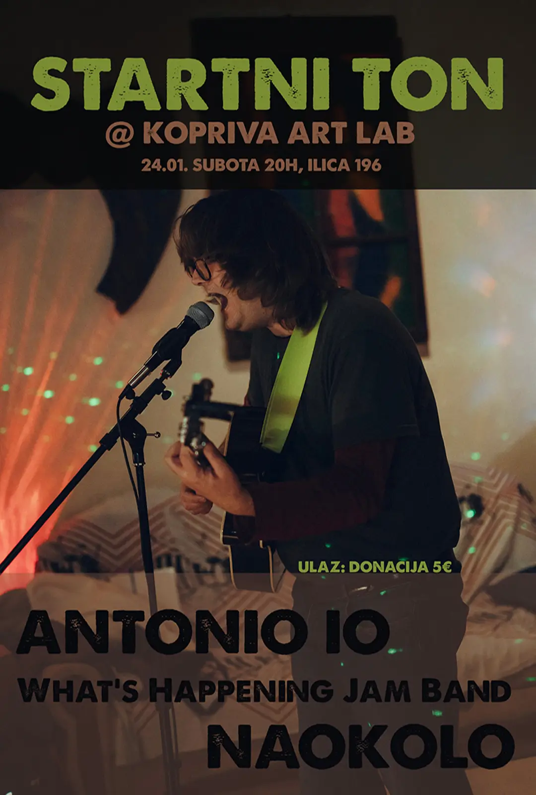 Zajedno sa svojom gitarom i dječjim glasom, pokušat će vas nasmijati, natjerati na razmišljanje i maziti;sve će se to dogoditi zahvaljujući njegovoj stand-up komediji, koju će Antonio pokušati integrirati sa svojom glazbom. Te večeri, 24. siječnja, Antonio će izvesti pjesme sa svog albuma I O Naive, koji crpi mnogo inspiracije iz cijele DIY i LO-FI scene, s posebnom pažnjom na kantautore poput Daniela Jhonstona i bendove poput Televisions Personalities. Sve naglašeno notama punka, noisea i dream popa.